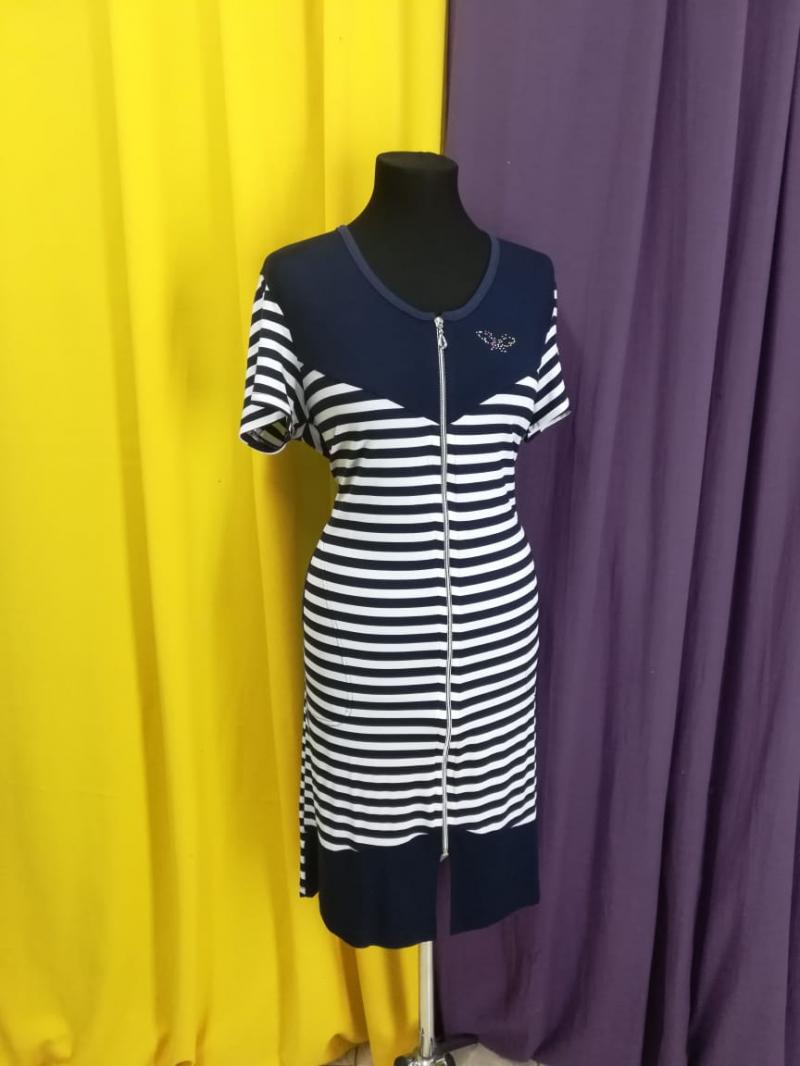 Стильный женский халат на молнии с коротким рукавом. По бокам расположены карманы.