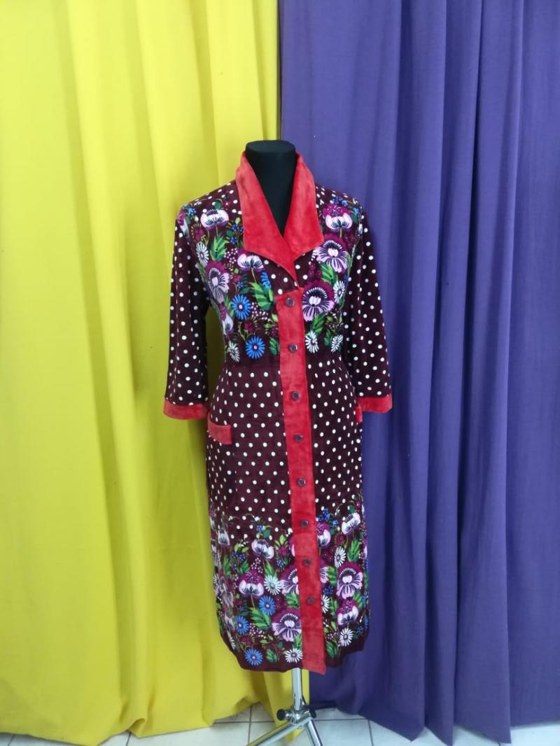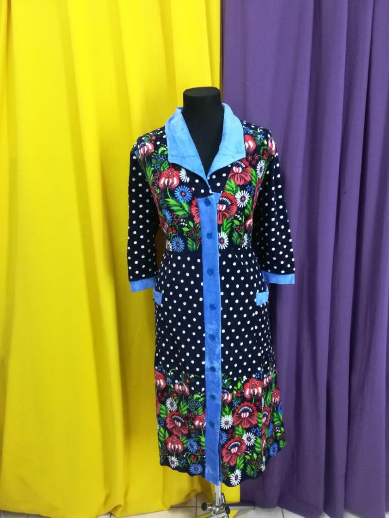 Модель выполнена с вытачками и подрезом под грудью, что позволяет скрывать объем талии. Отложной воротничок и рукав 3/4